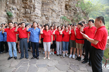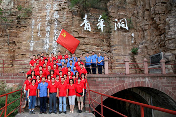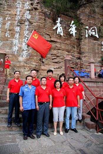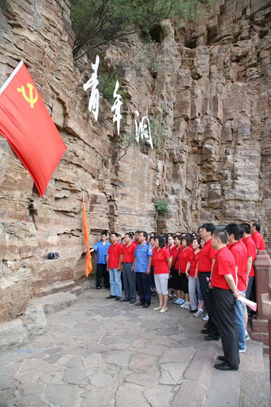 在青年洞前,全体党员面对党旗庄严宣誓,重温入党誓词。大家纷纷表示,一定要把具有现实意义和时代价值的红旗渠精神带到今后的工作中去,时刻以红旗渠精神激励自己,爱岗敬业,艰苦奋斗,积极工作,为党徽增色,为党旗添彩,为企业的建设发展做出更大的贡献。