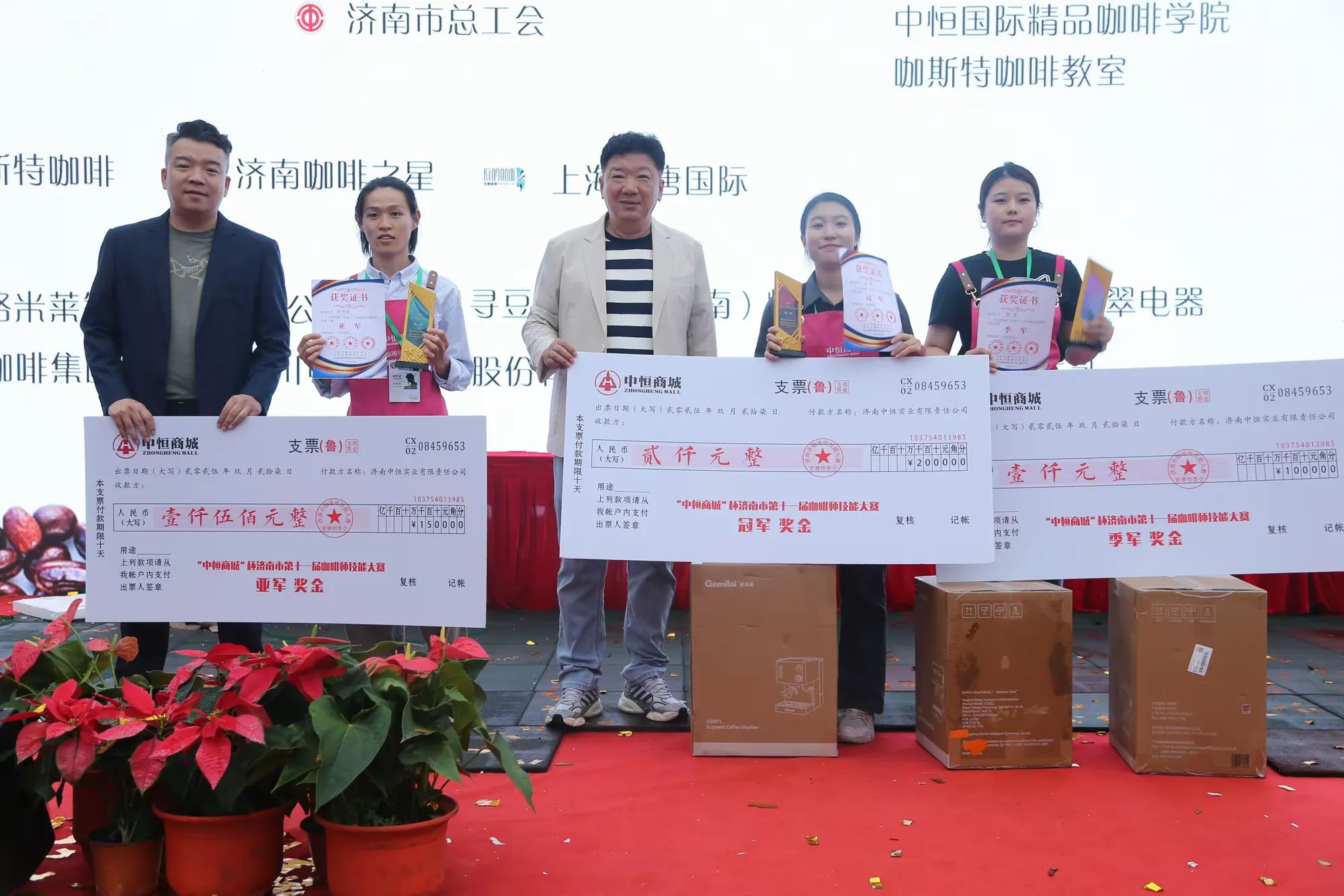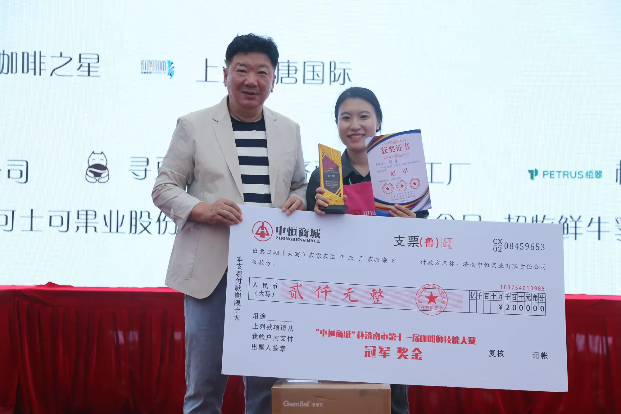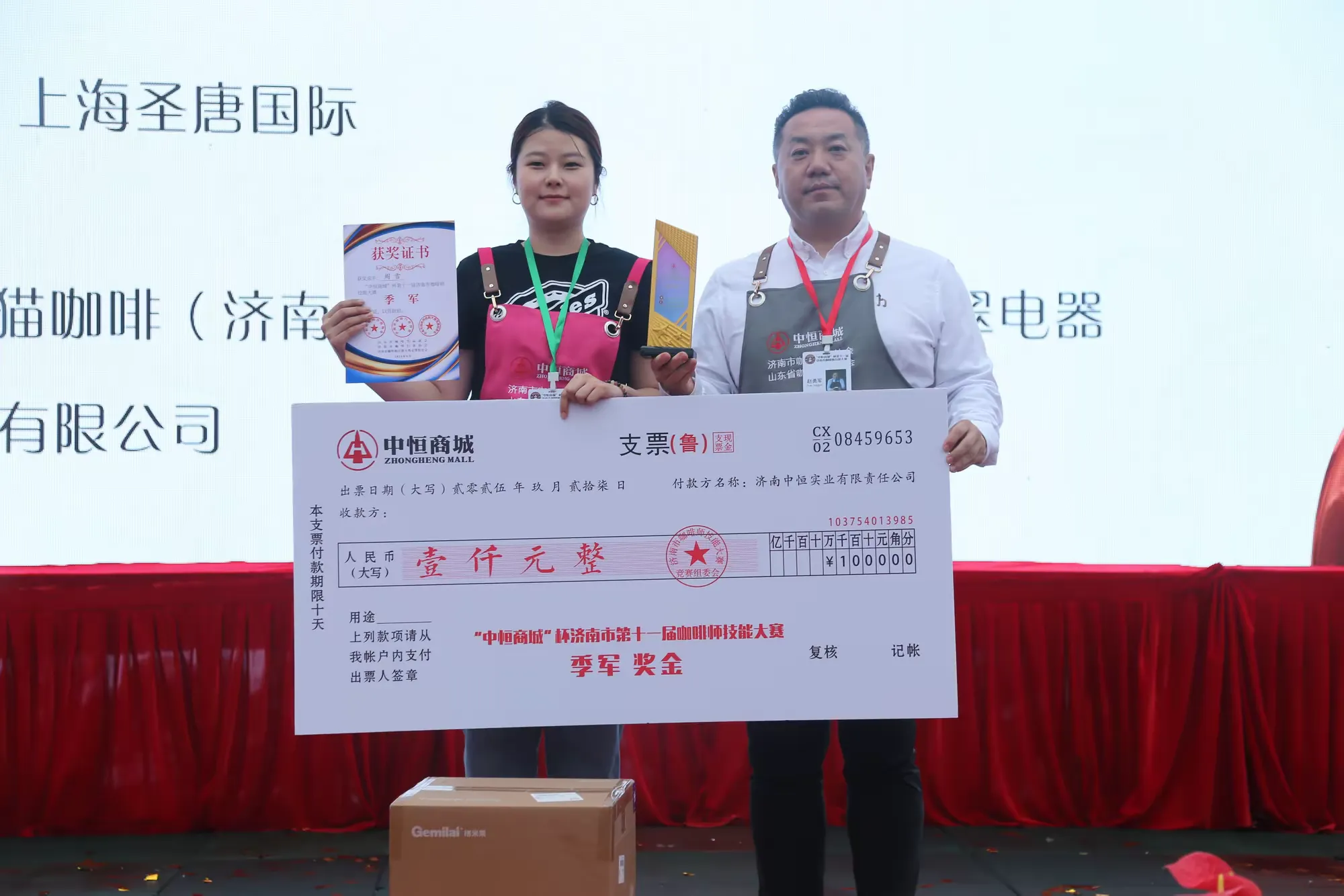 山东省咖啡饮品商会会长、中恒商城党委书记、总经理刘磊,为获得冠军的选手程苗颁奖。
