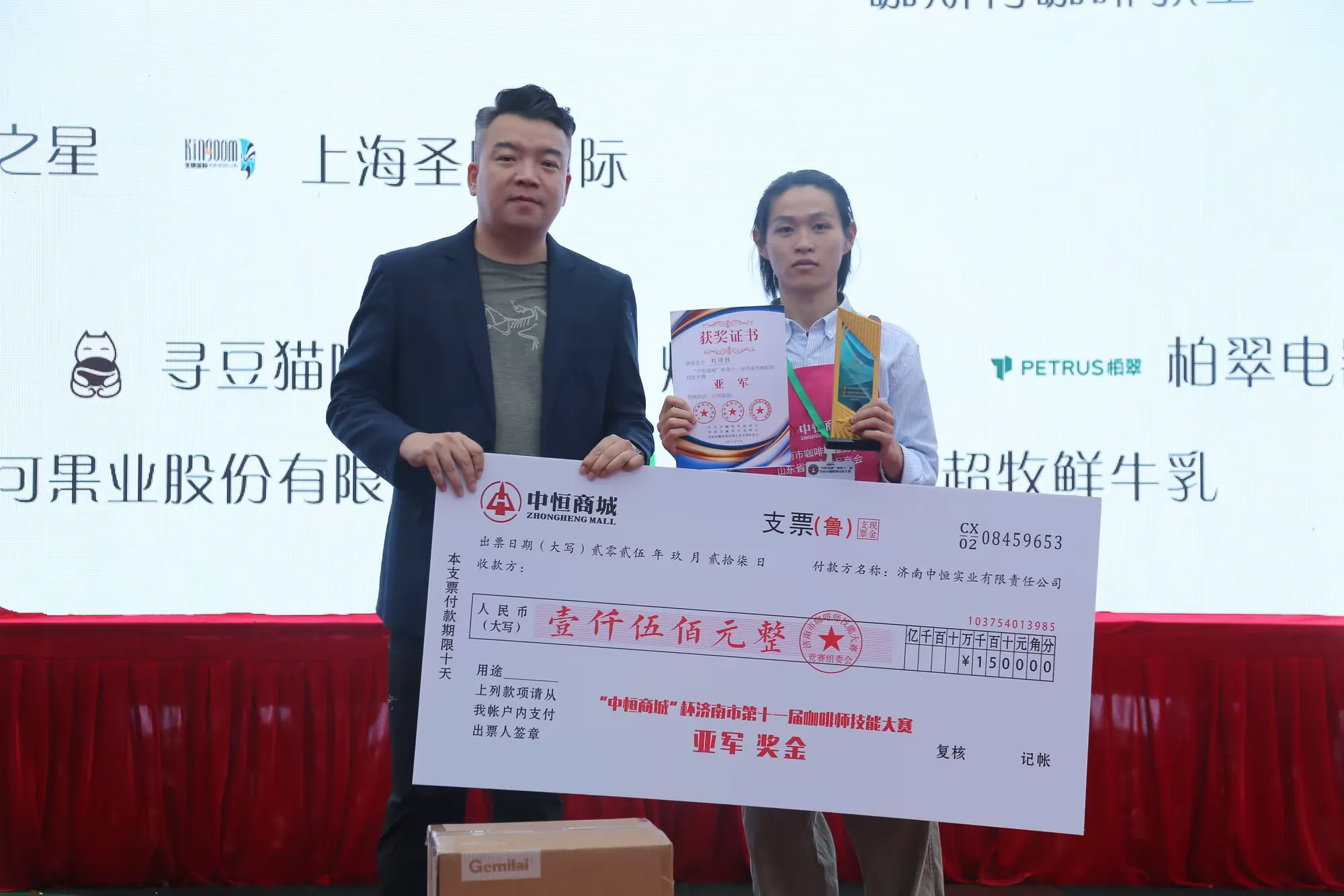 济南咖啡行业协会会长、中恒商城副总经理董良,为获得亚军的选手刘传胜颁奖。